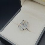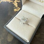 This particular oval leans more towards a proper, elongated oval, rather than a moval. Its proportion accentuates the finger beautifully. It’s almost as if the diamond is floating on your finger, while our signature double-claw prongs give it a harmonious and modern pop.